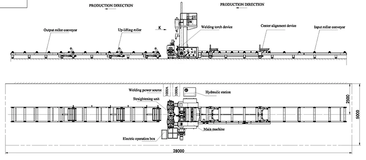 Standardowe linie spawalnicze ZHJ3-in 1-godzinne składa się z jednej stolika rolki wejściowej, głównej stacji spawania i prostowania, stolika wyjściowego. Na głównej stacji spawalniczej i prostownictwa tam zainstalowanych jednostek odzyskiwania strumienia, głowicy spawalniczej z pochodnią i urządzeniami do zacisków dla kołnierza i sieci. Standardowa linia.